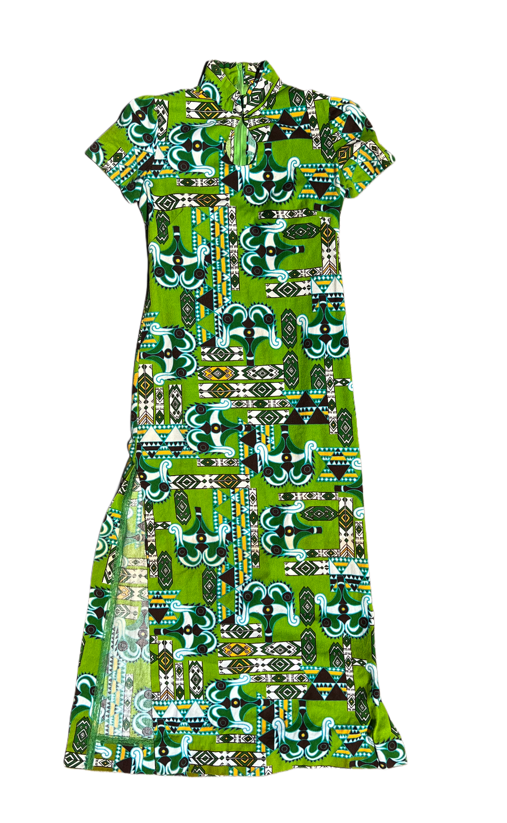 1960s Green Psychedelic Tribal Print Maxi Dress