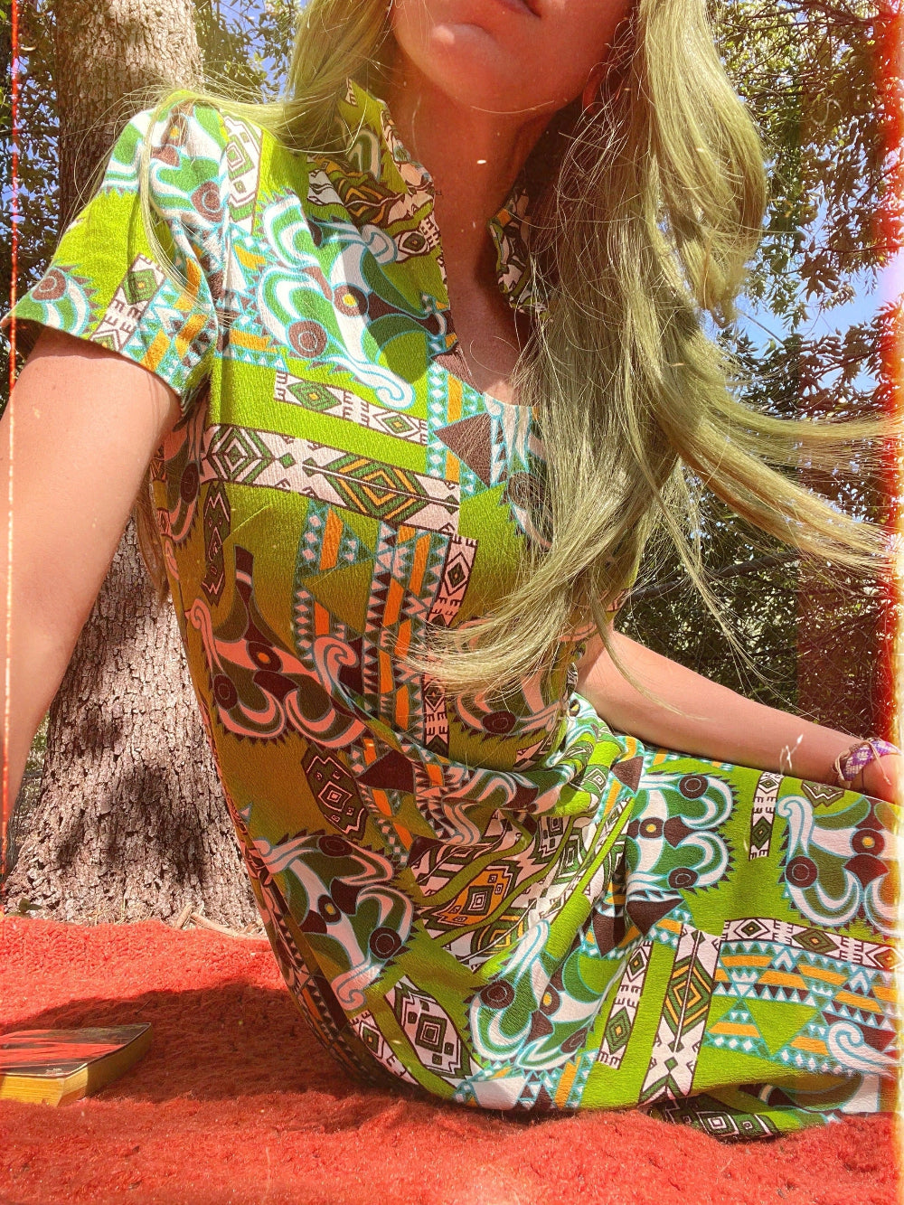 Bold chartreuse/emerald green print features abstract motifs, triangles & mirrored shapes in a pattern both tribal & futuristic— perfectly encapsulating the global-influence-meets-modernism trend of the late 1960s early 70s.