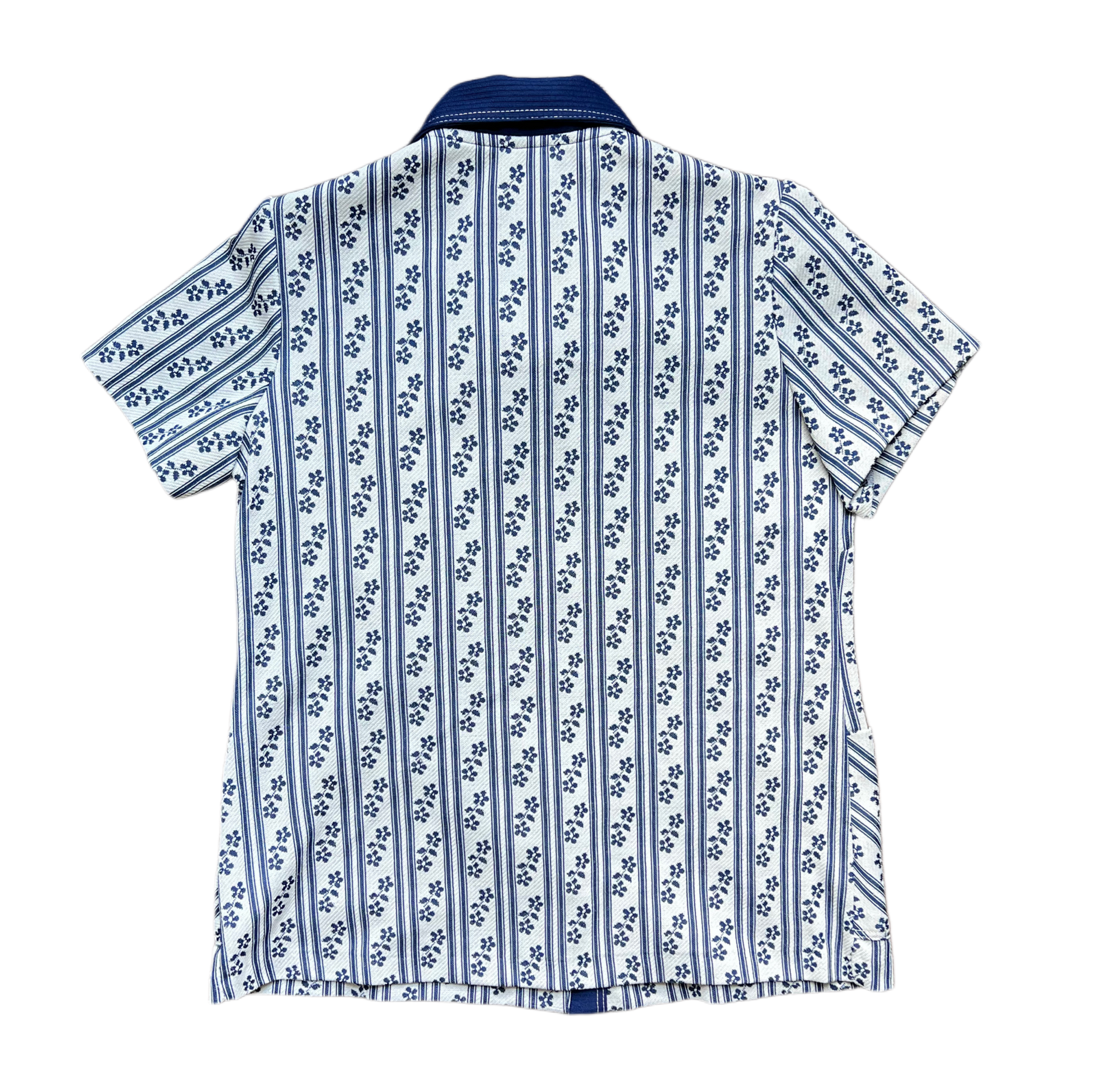 Backyard BBQ meets backroad band gig. Small pleats in the chest, dagger collar, button front, patch pockets, true 70's prairie grit.