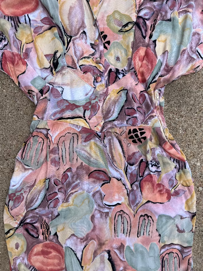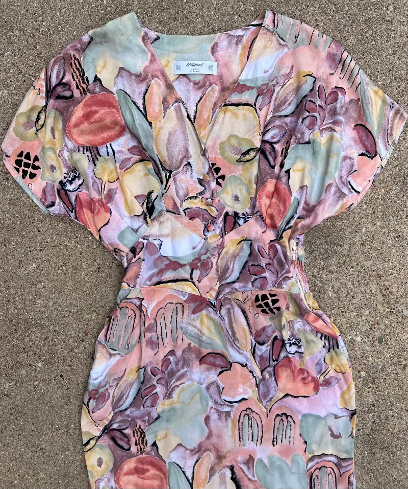 Soft-spoken rebel in bloom. 1980s St. Michael watercolor floral dress with painterly pastels of peach, rose, mint & lavender. Cinched waist, deep V-neckline, side pockets (yassss) & fluid rayon-like drape. Romantic, yet structured— made for summer wine & main character energy.