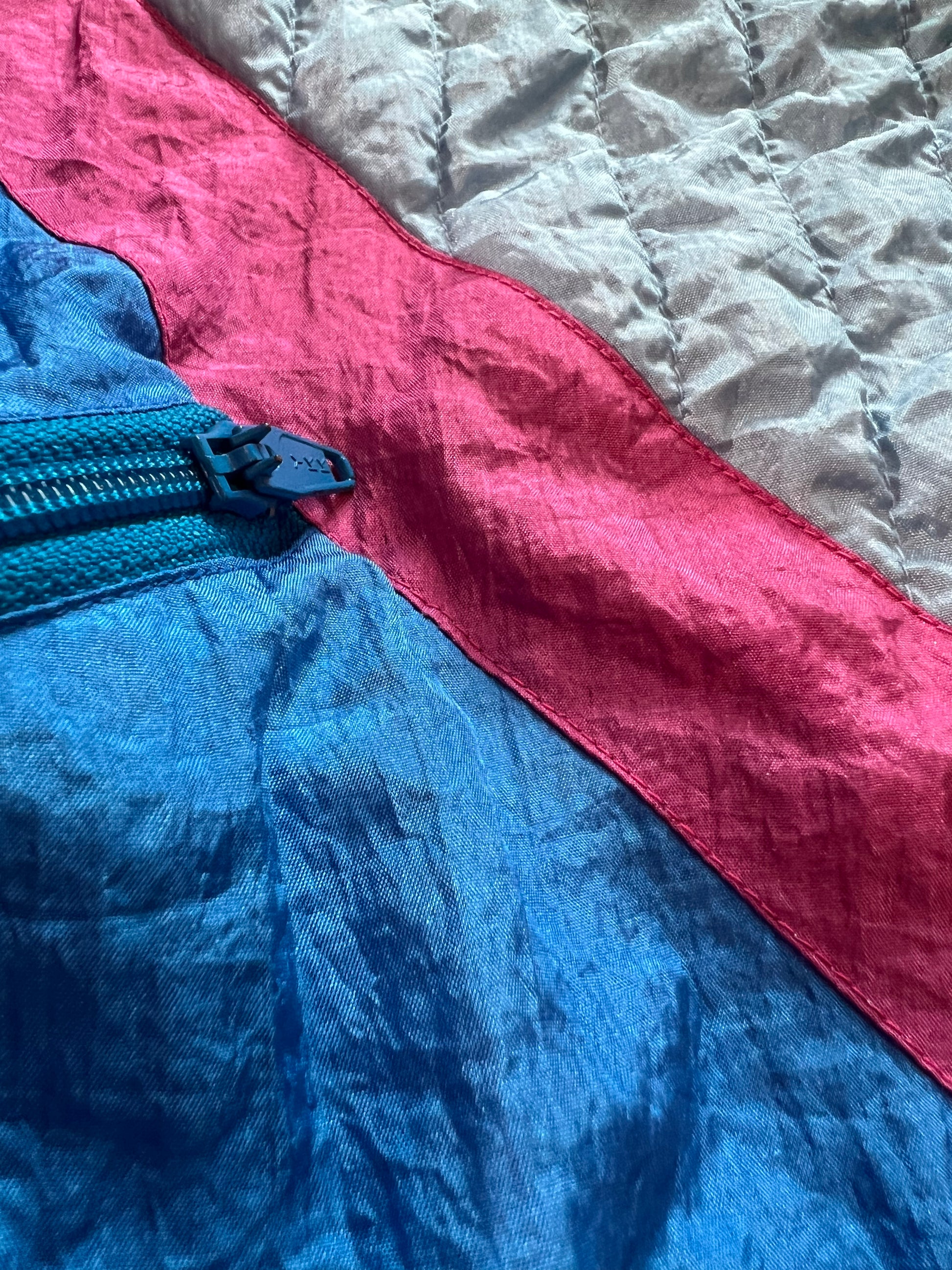 80/90's Pacific blue windbreaker with sky blue, magenta & white striped accents. This bad boy means bizznasss. THE SLEEVES ARE REMOVABLE.