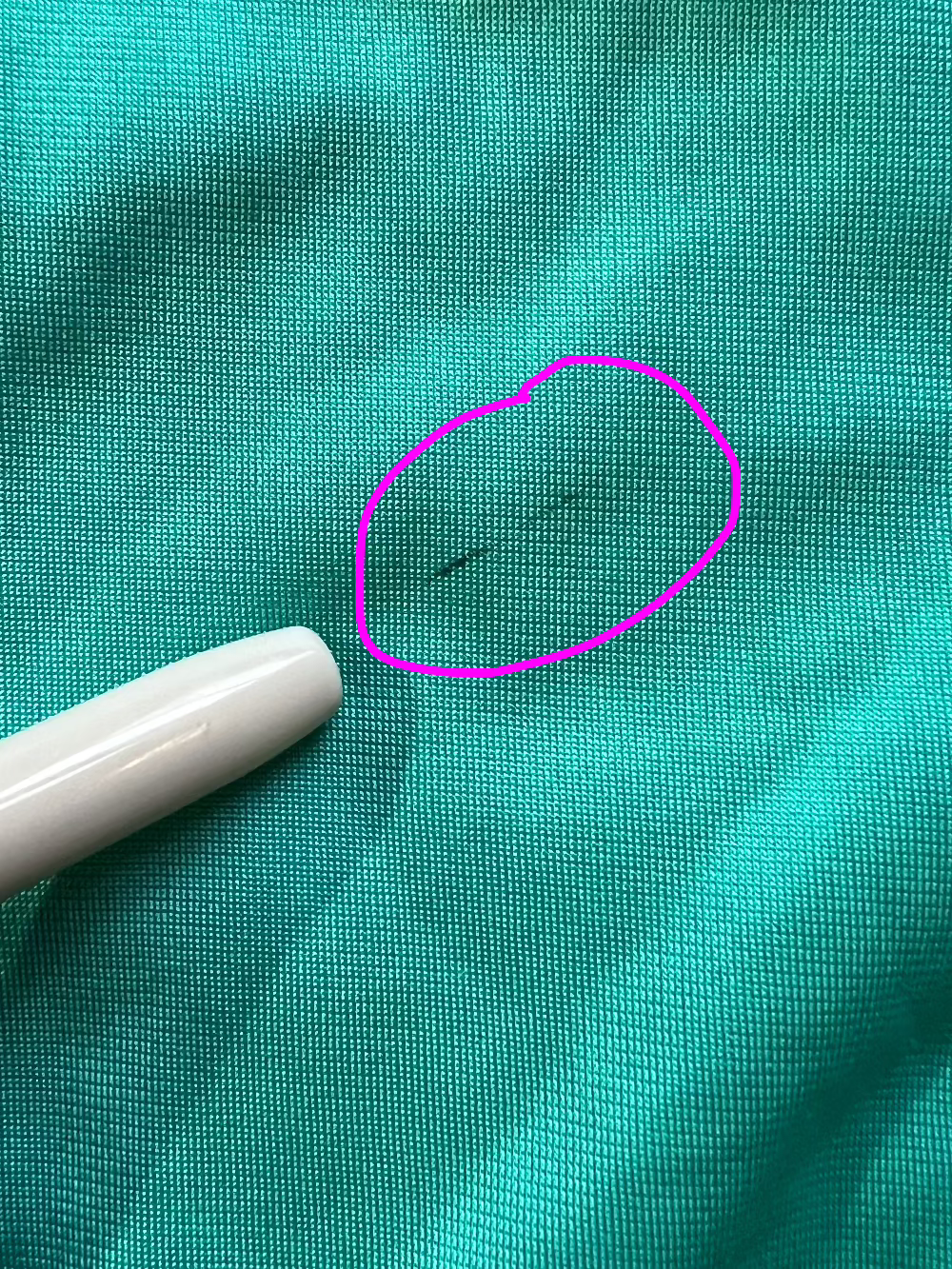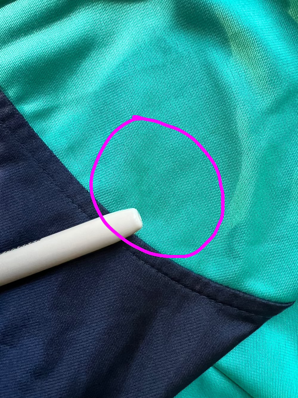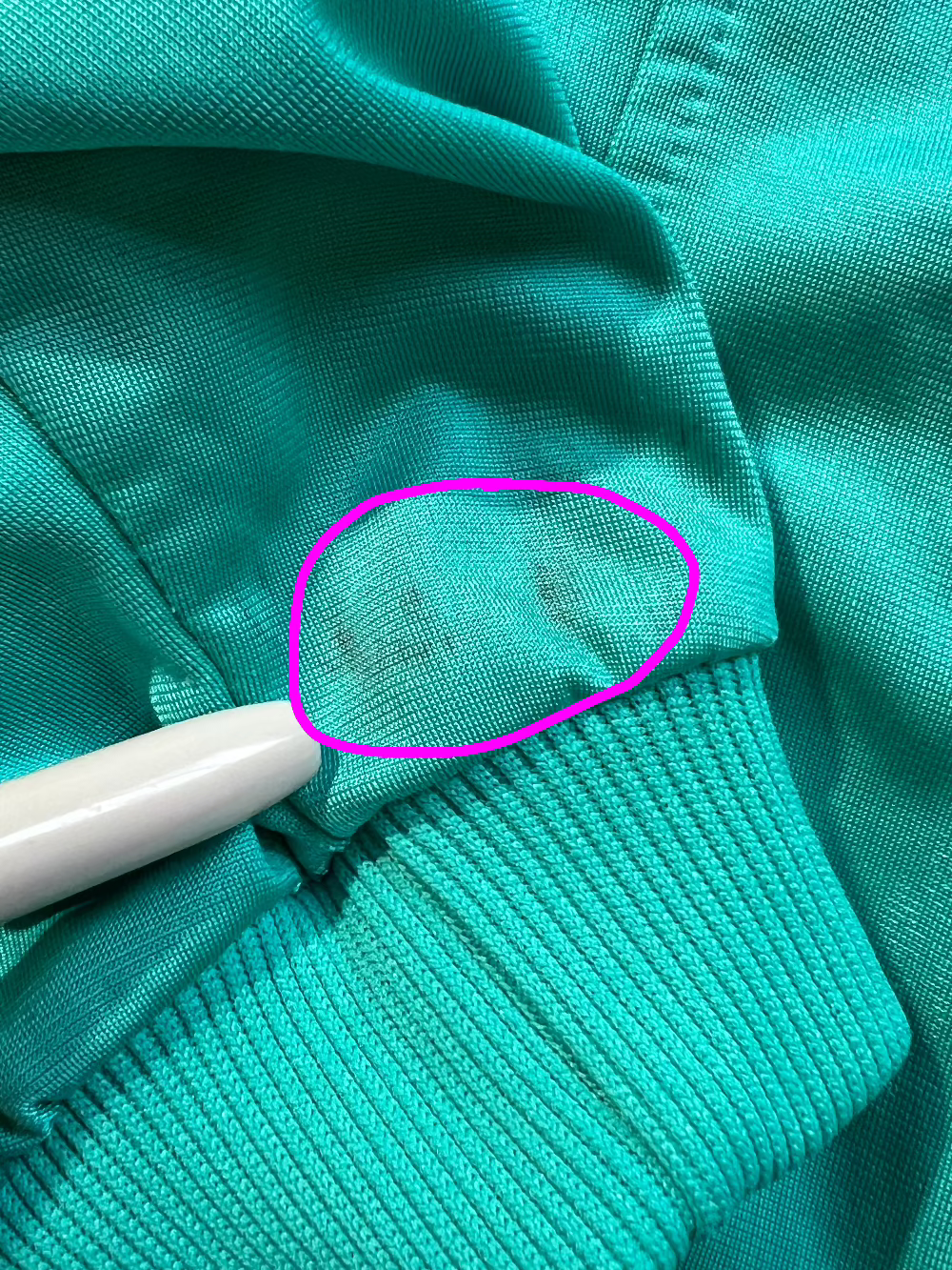 ***pen mark located front right under the logo, scuff on the left arm cuff & white marking on back