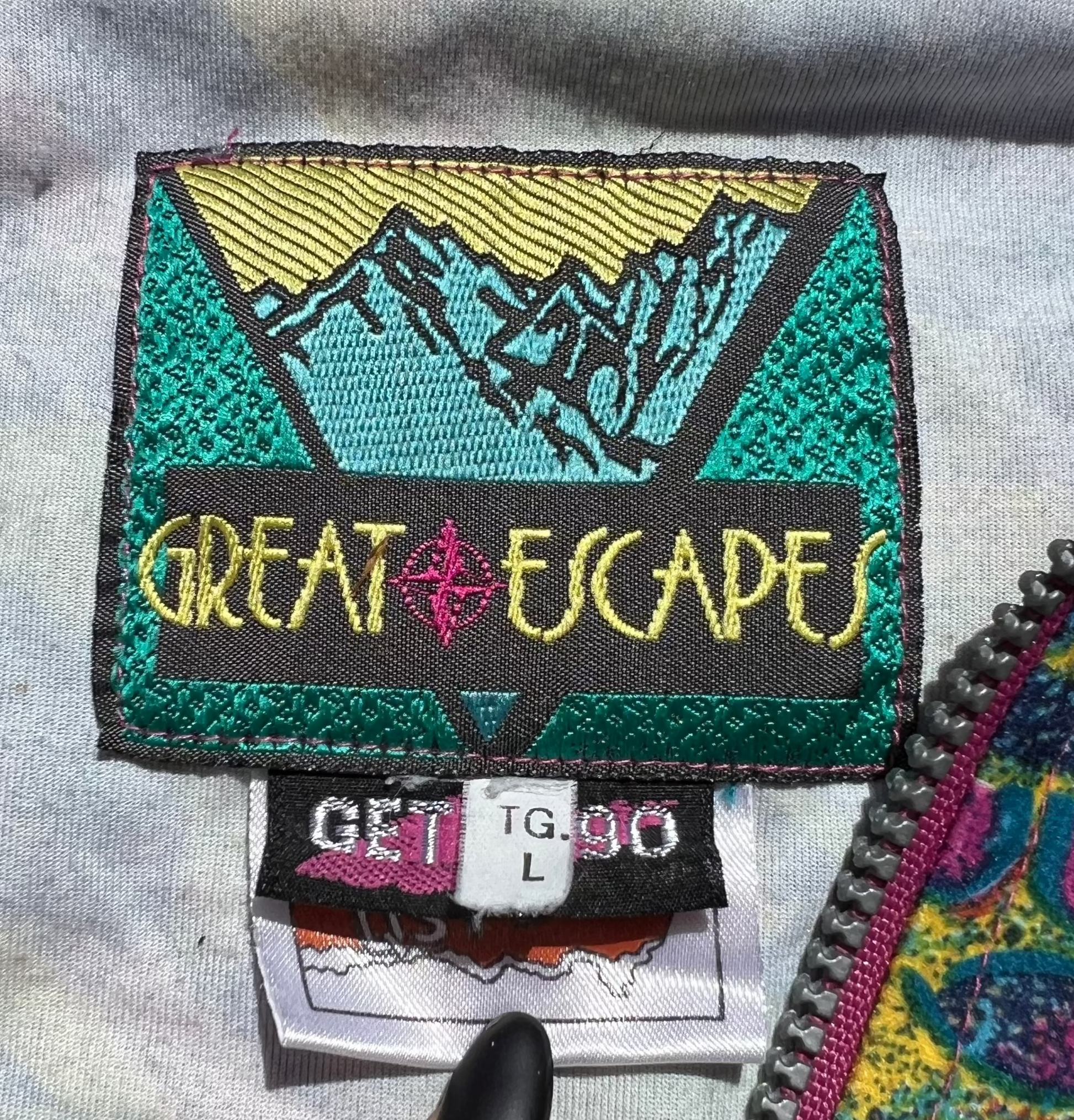 These colors are SO GOOD! Great Escape logo embroidered on front & zipper detail. Optional cinch at the bottom. Fits like a XL.