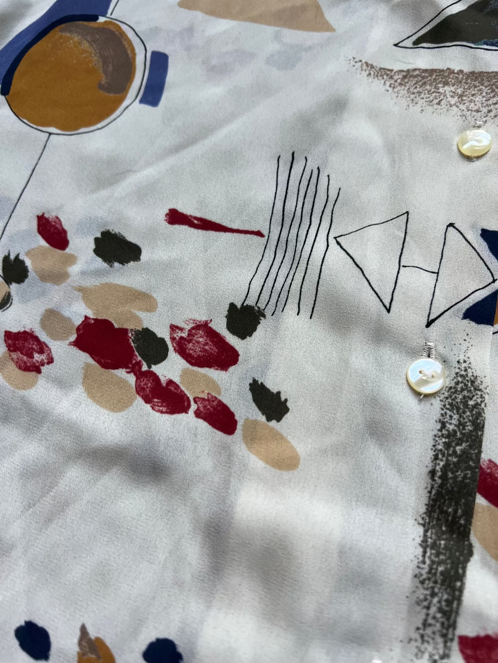 90s muted earth tone geometric button up. Relaxed fit, lightweight, soft drape.