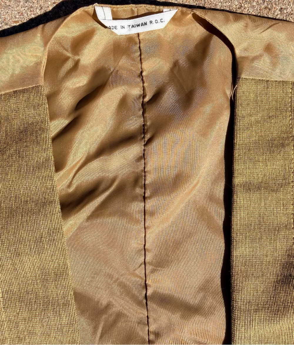 Sleek vintage men’s vest by Index featuring a deep scoop neckline, double-breasted brass-tone button front & pointed hem. Warm camel-brown woven fabric w/ two welt pockets & full satin lining. Classic 90s tailoring w/ a slightly Western-meets-steampunk edge.