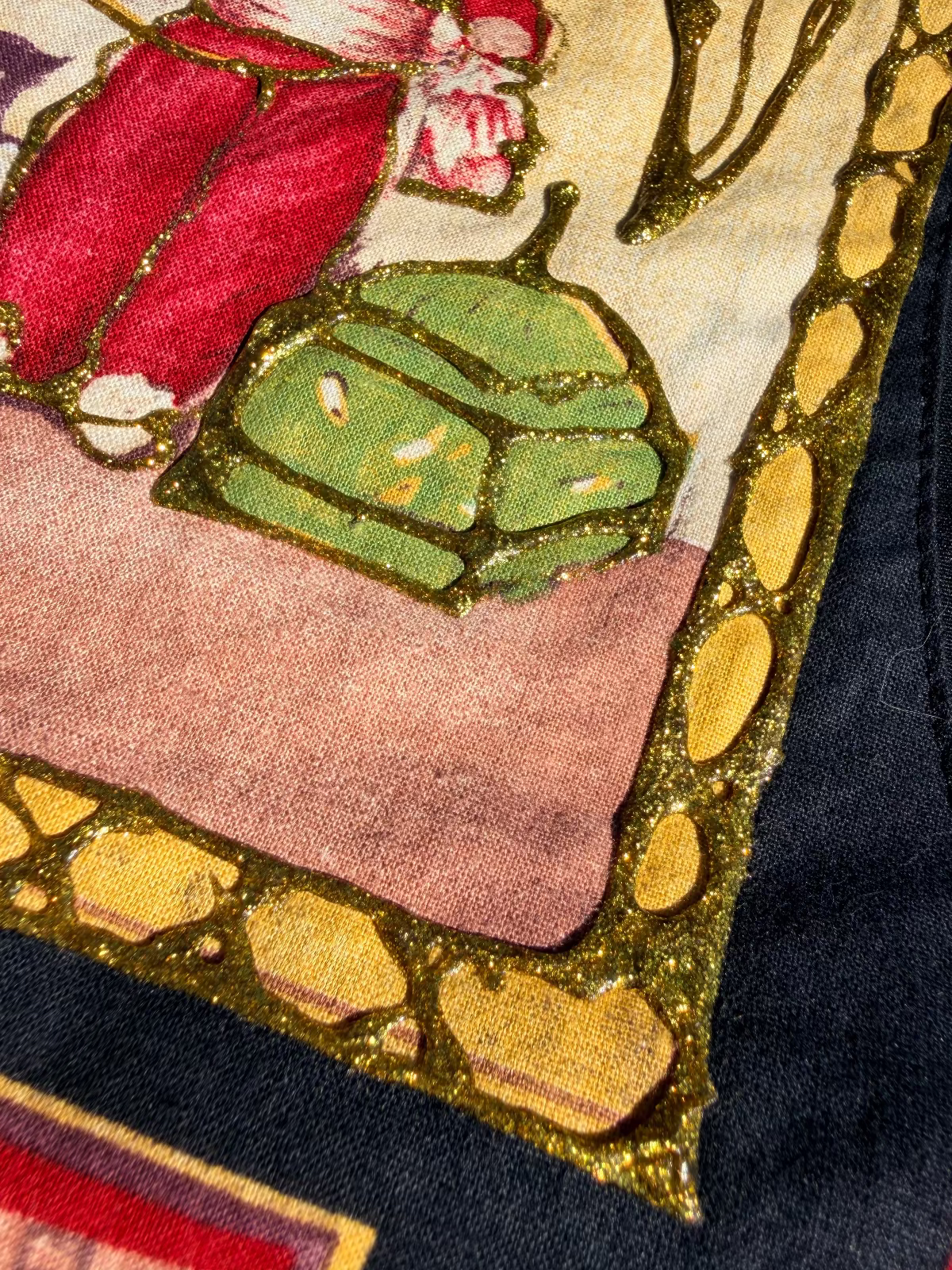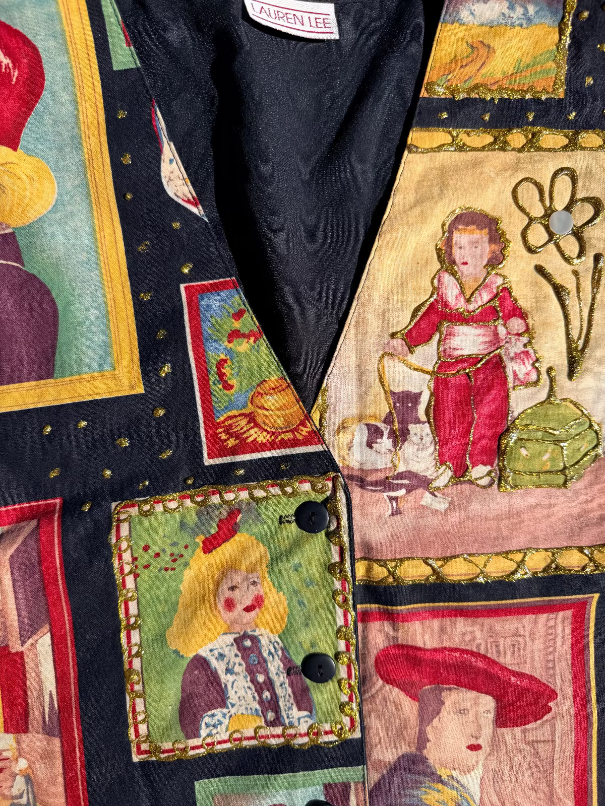 Fun TEACHER-CORE vest by Lauren Lee featuring a collage of framed portrait/still-life prints. Bold primary & earth-tone palette on a black background w/ a classic V-front silhouette & button closure. Lightweight woven fabric with a smooth drape— a wearable quirky gallery wall! The glitter puff paint is SO 90's, I LOVE IT!