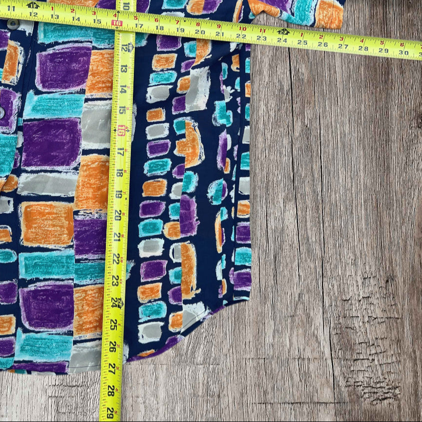 80s/90s Int. Couture orange/teal/purple/navy geometric button up w/ shoulder pads. VIBRANT colors, this one is a stunner!
