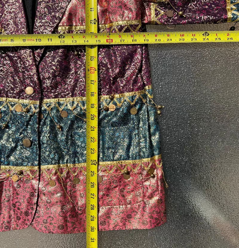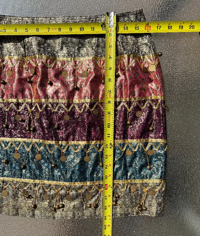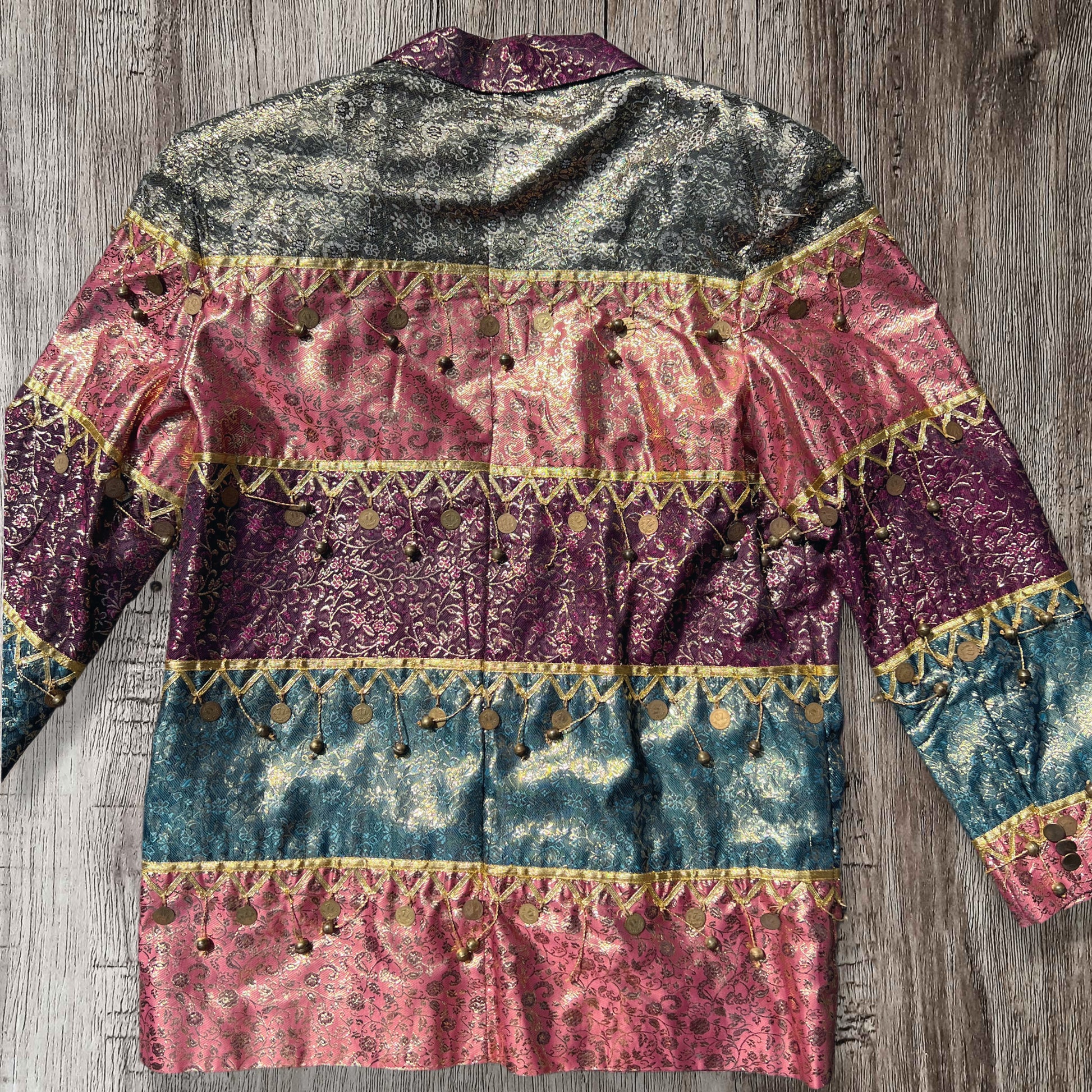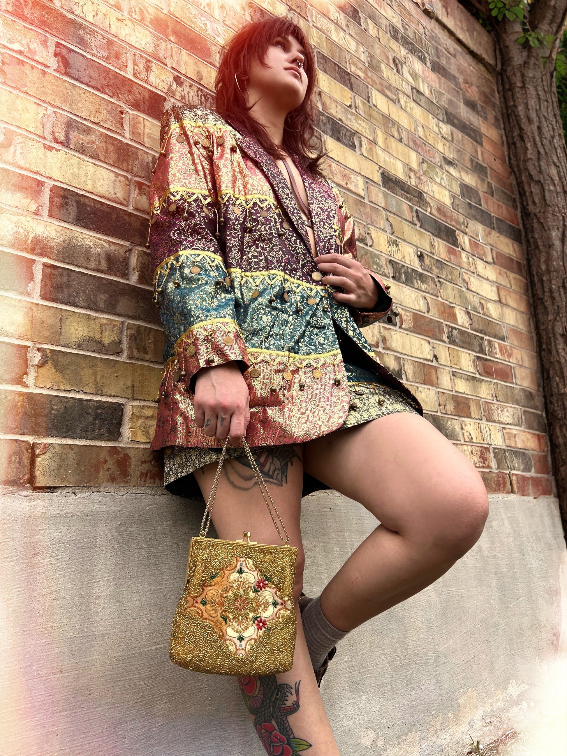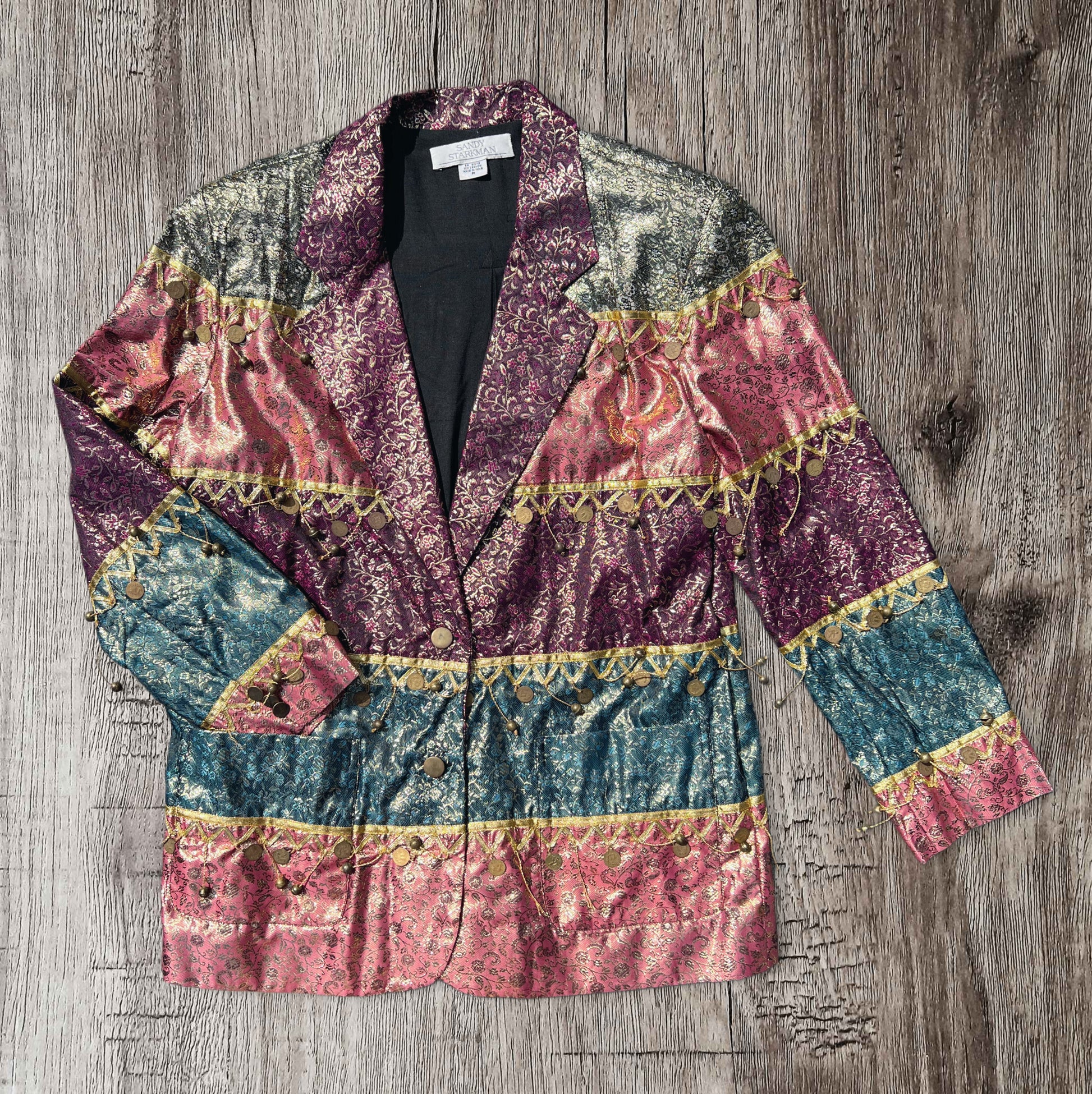 Statement two-piece set by cult designer Sandy Starkman, made in India. 1990s metallic brocade jacket (w/ shoulder pads) & matching mini skirt in jewel-toned patchwork of teal, magenta, gold & plum, finished w/ gold thread & dangling coin trim. Structured blazer w/ single-button front & matching high-waist skirt. A one-of-a-kind maximalist relic that fuses global glamour w/ rock-n-roll opulence. Just, WOW.