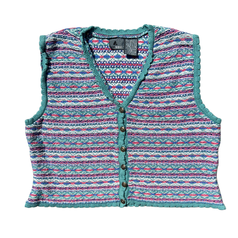 1994 Soft-serve color palette sidewalk sass Liz Wear knit vest. Teal, raspberry & lilac stripes w/ scalloped edges & tiny metal buttons. A dose of pre-internet attitude, craft-store charm & Euro streetwear.