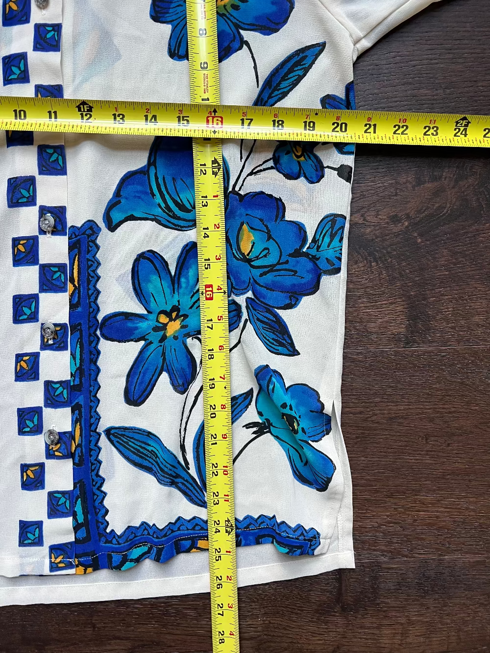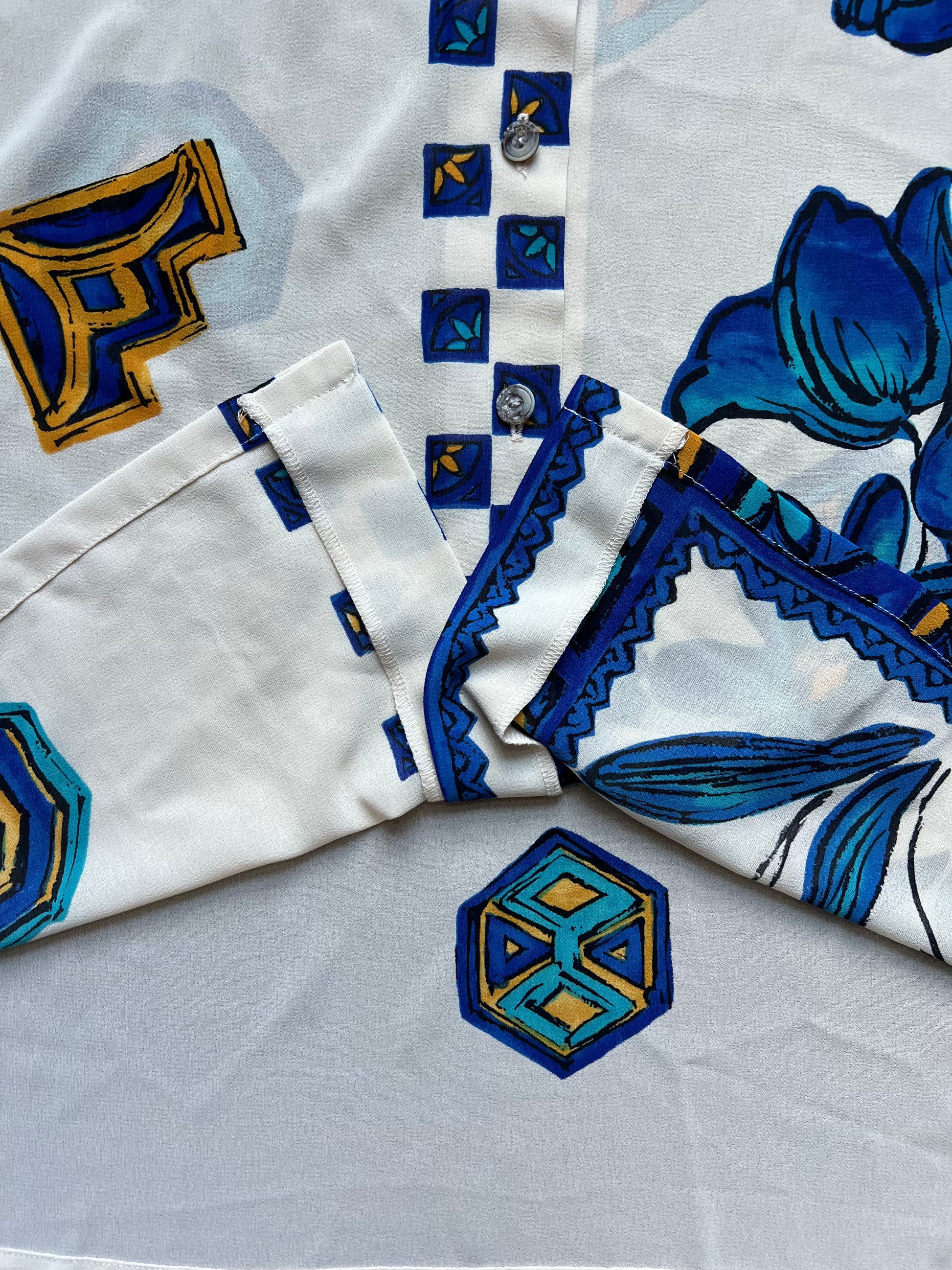 80s/90s Belle Mode Tokyo cream, blue & yellow floral/geometric button up. Lightweight/Breathable, RAD detailing.